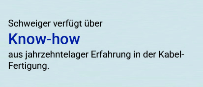 Seit über 30 Jahren steht die Schweiger Group für höchste Qualität in der Kabelkonfektion. Als erfahrener Spezialist unterstützen wir namhafte Unternehmen aus unterschiedlichsten Branchen – darunter Maschinenbau, Automation, Gebäudetechnik, Gerätebau, Verkehrstechnik sowie Defence & Security.